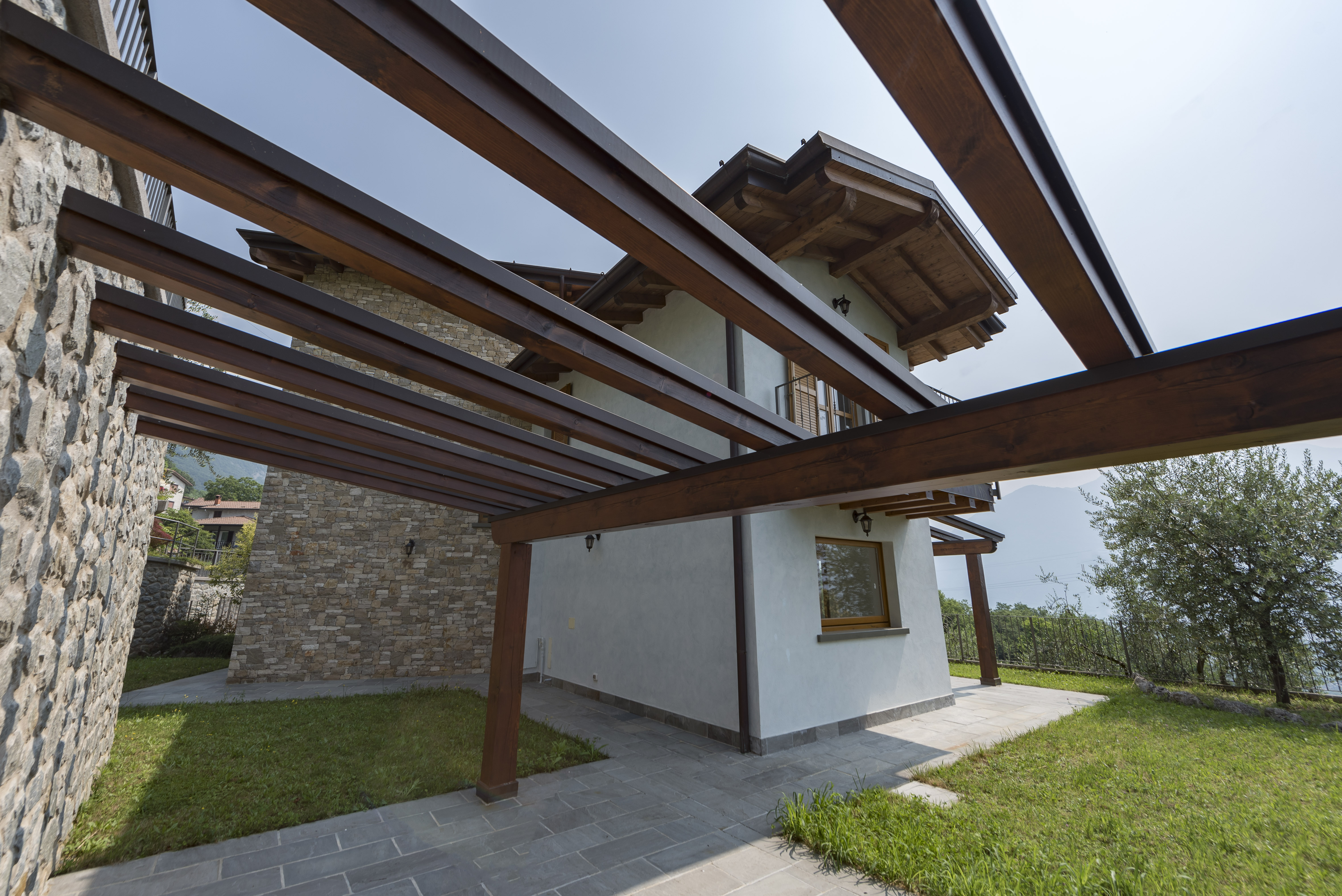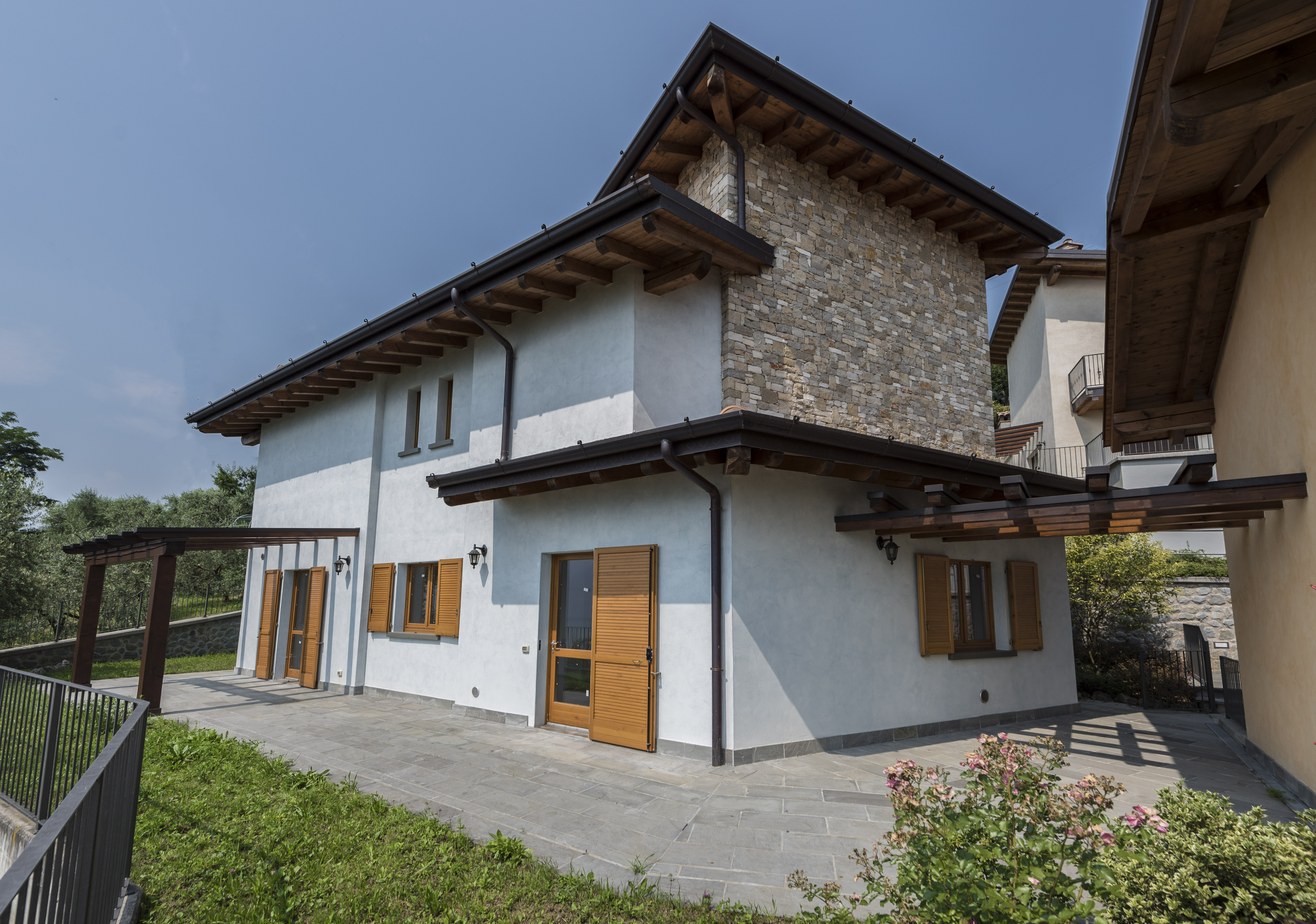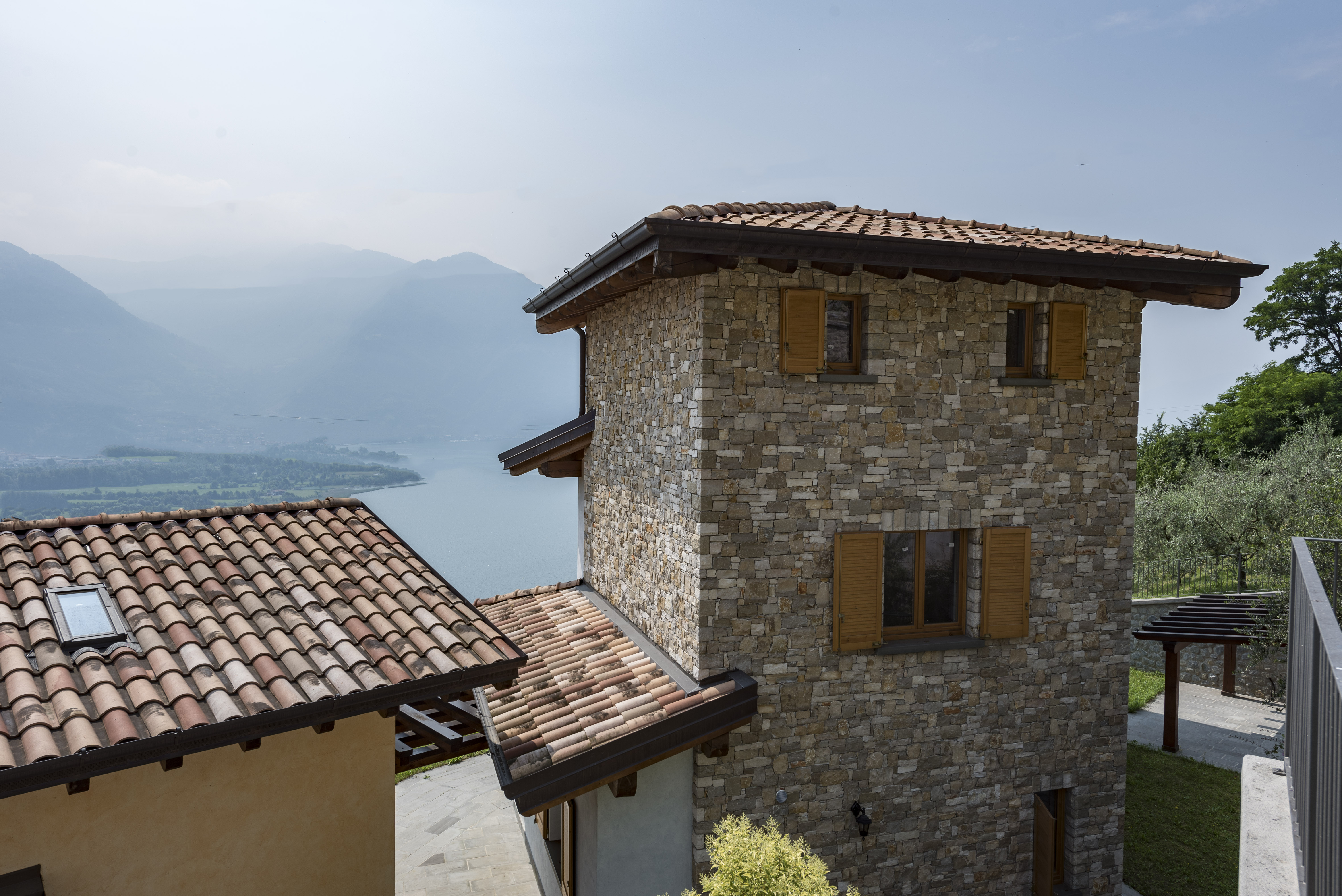 L’abitazione, libera su quattro lati, si distingue per l’architettura raffinata, valorizzata dalla pietra di Credaro a vista e dagli elementi in legno che richiamano il calore delle dimore di prestigio.