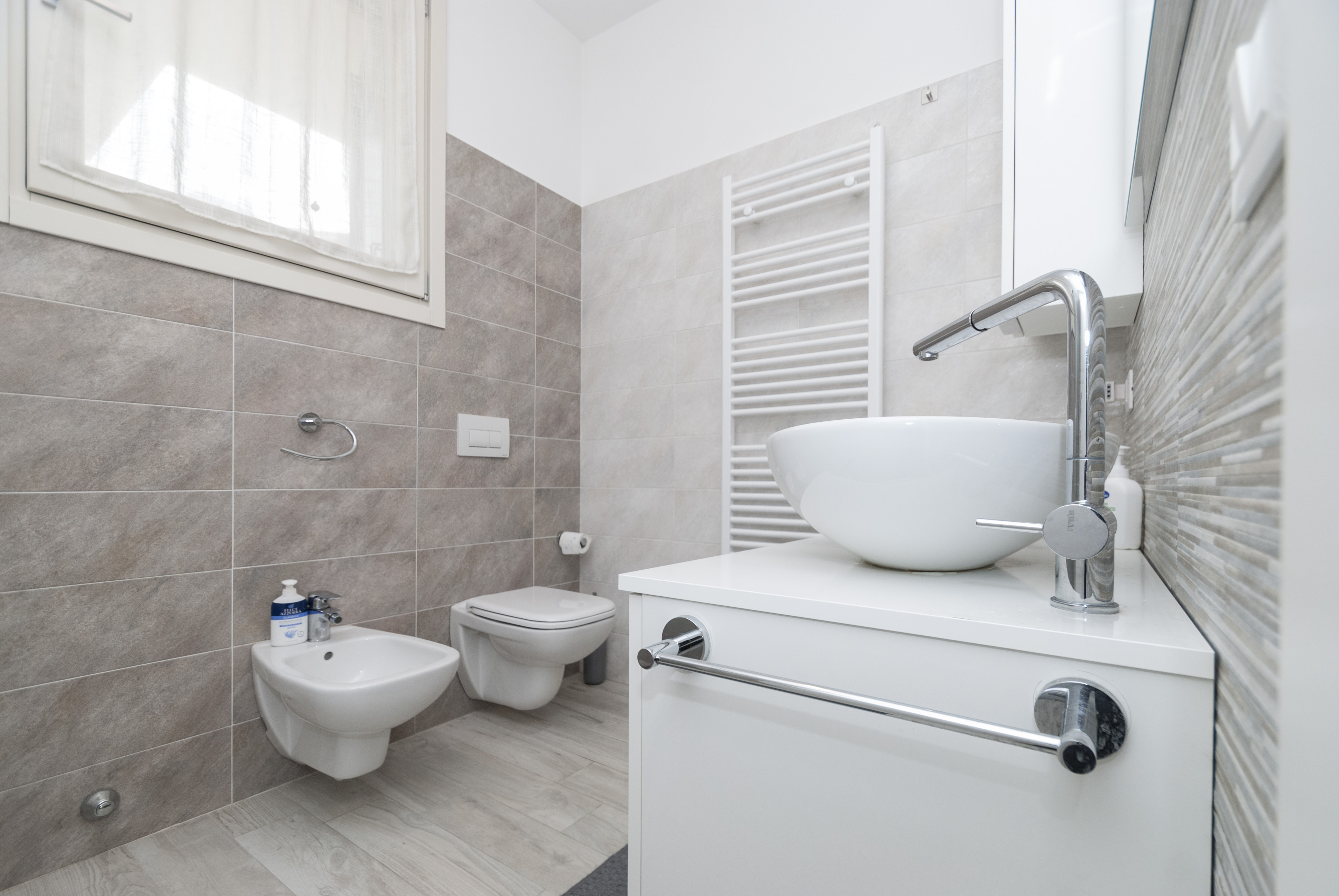Bagno finestrato, ampio disimpegno con armadio e lavatrice a scomparsa