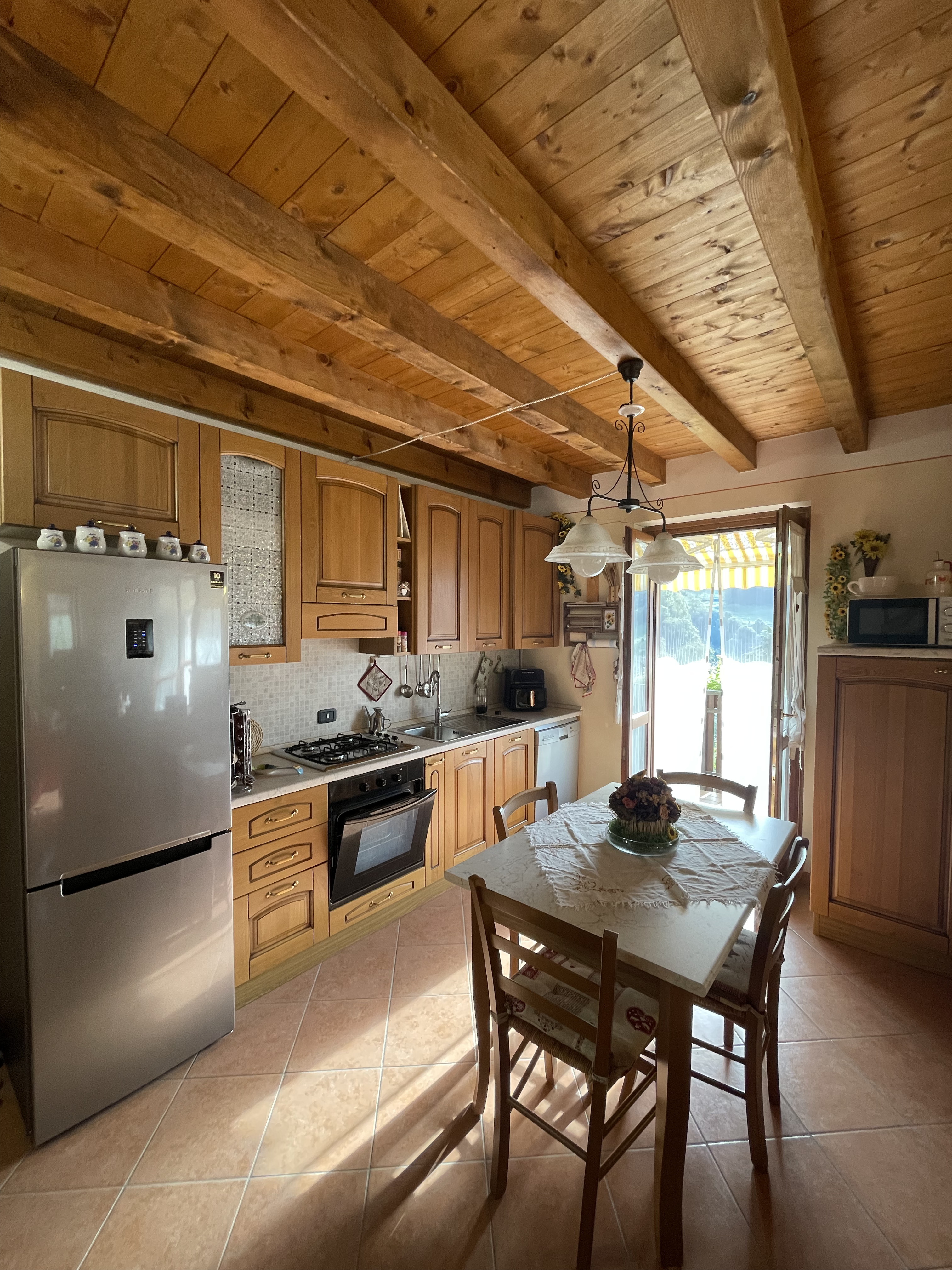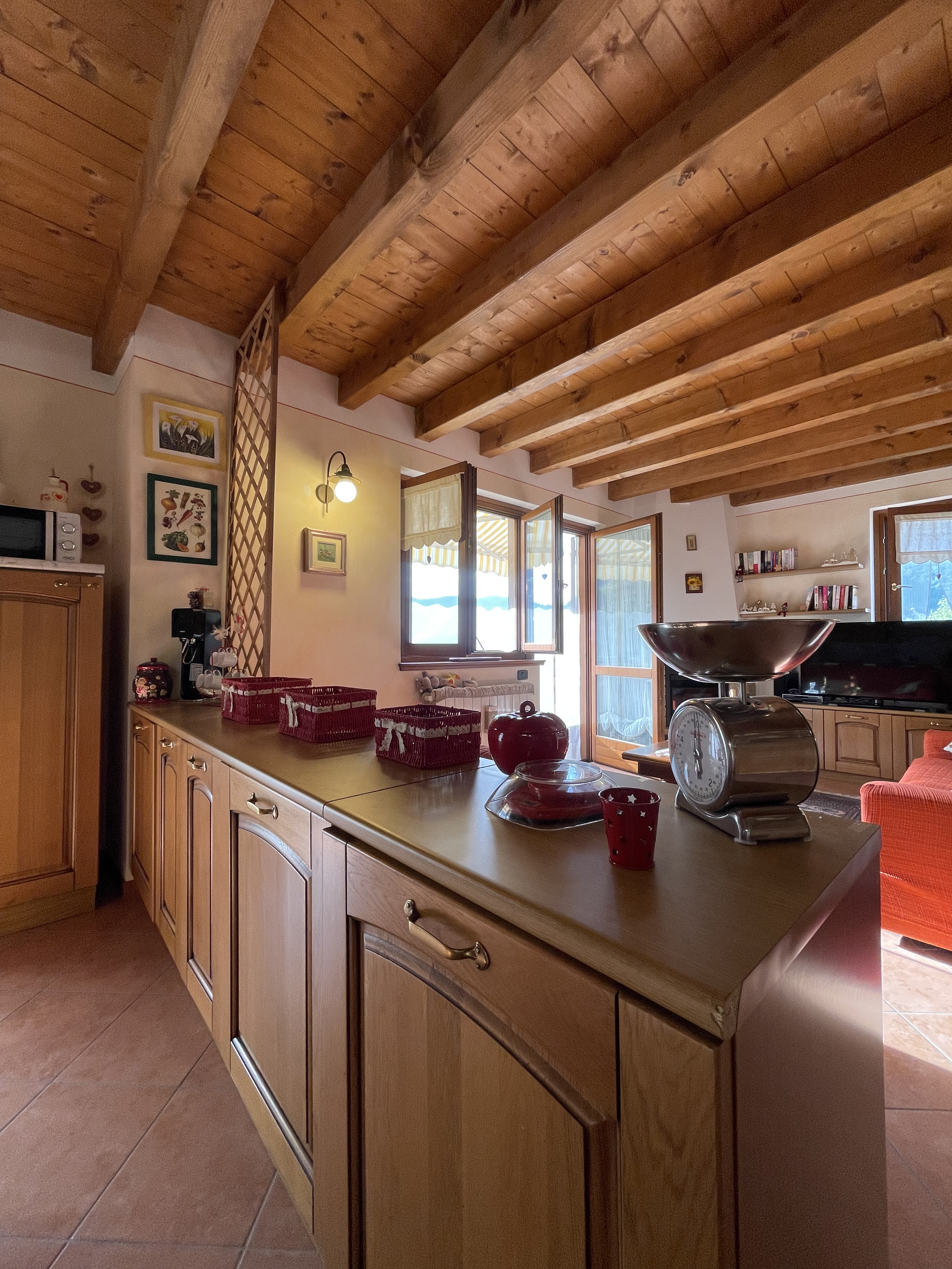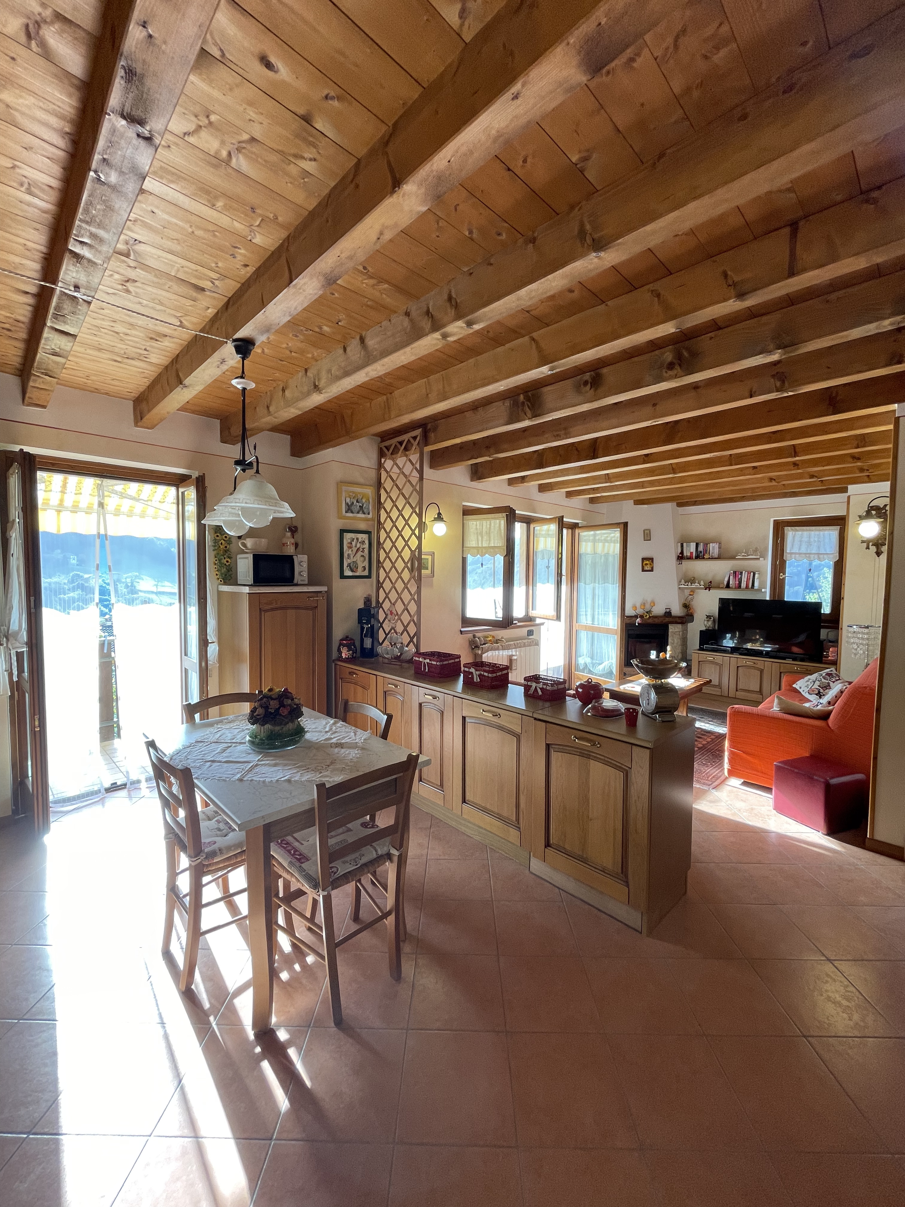 Cucina abitabile arredata con accesso diretto alla terrazza vivibile vista montagne