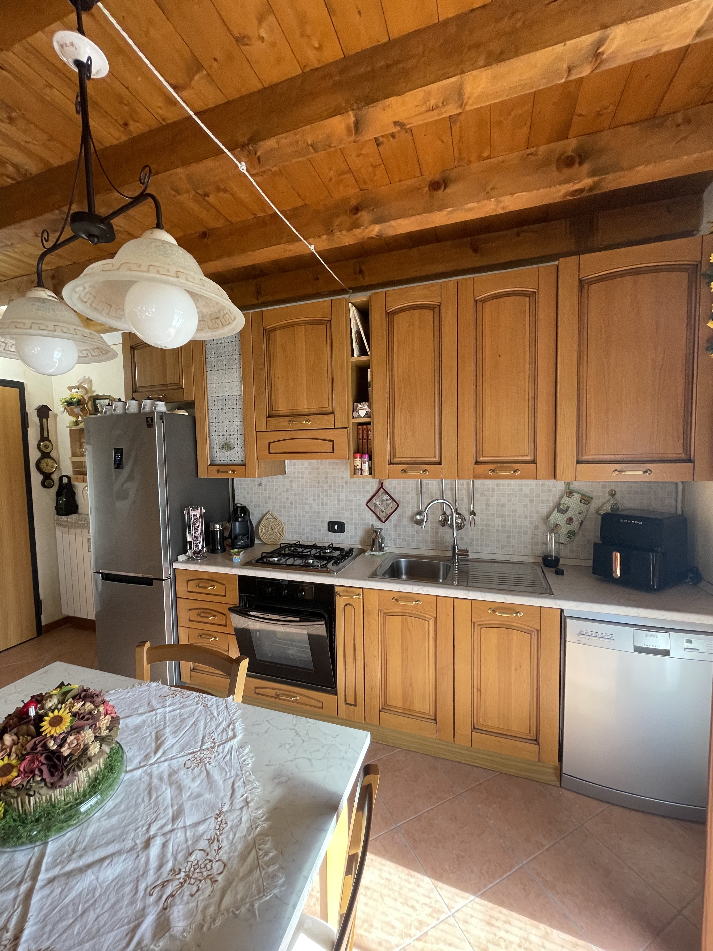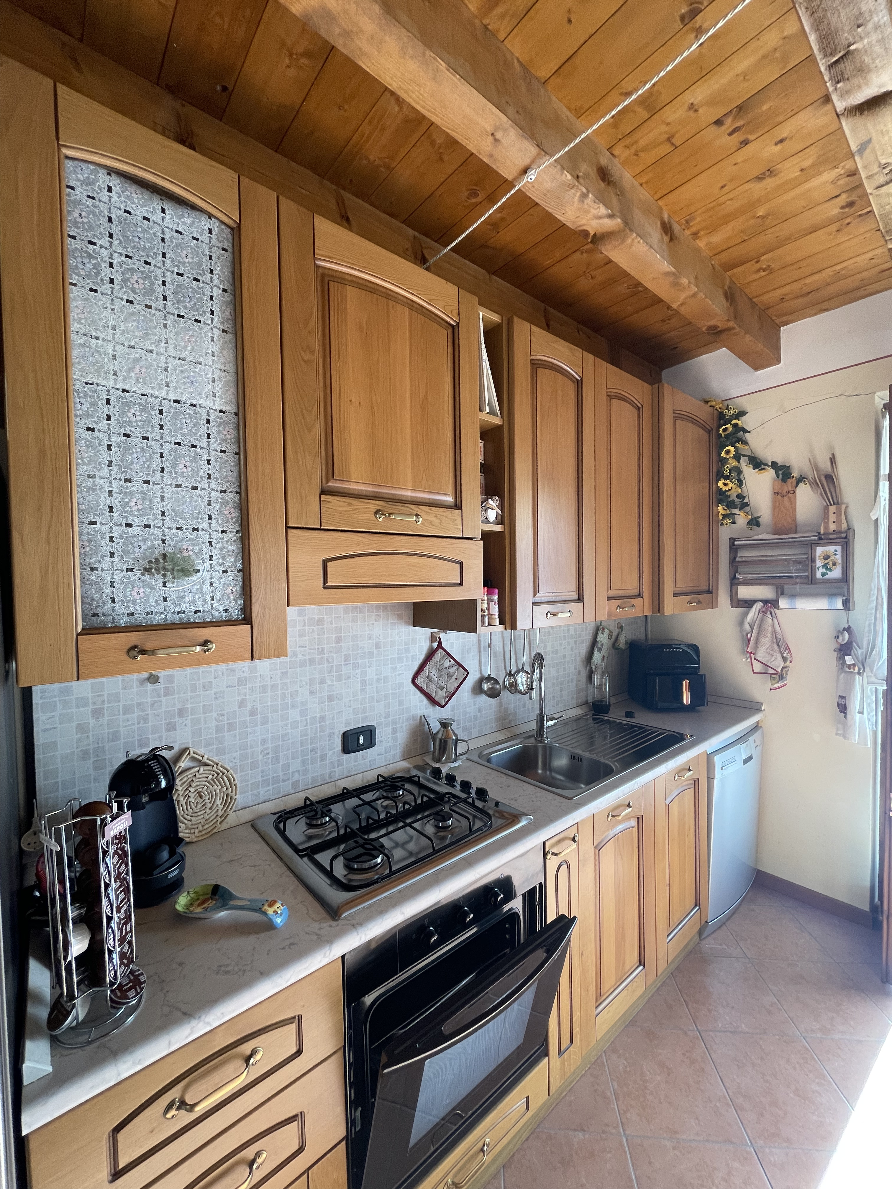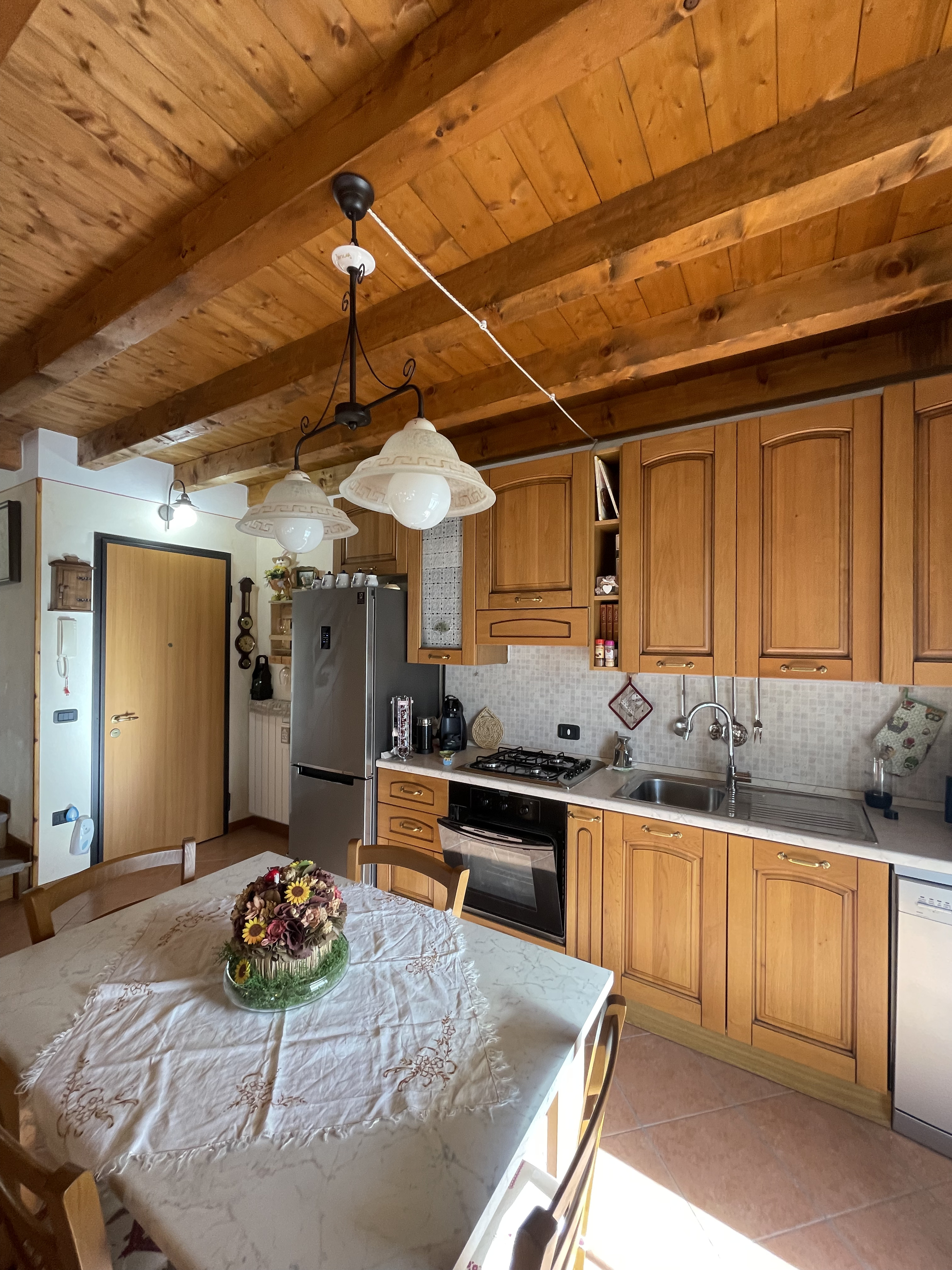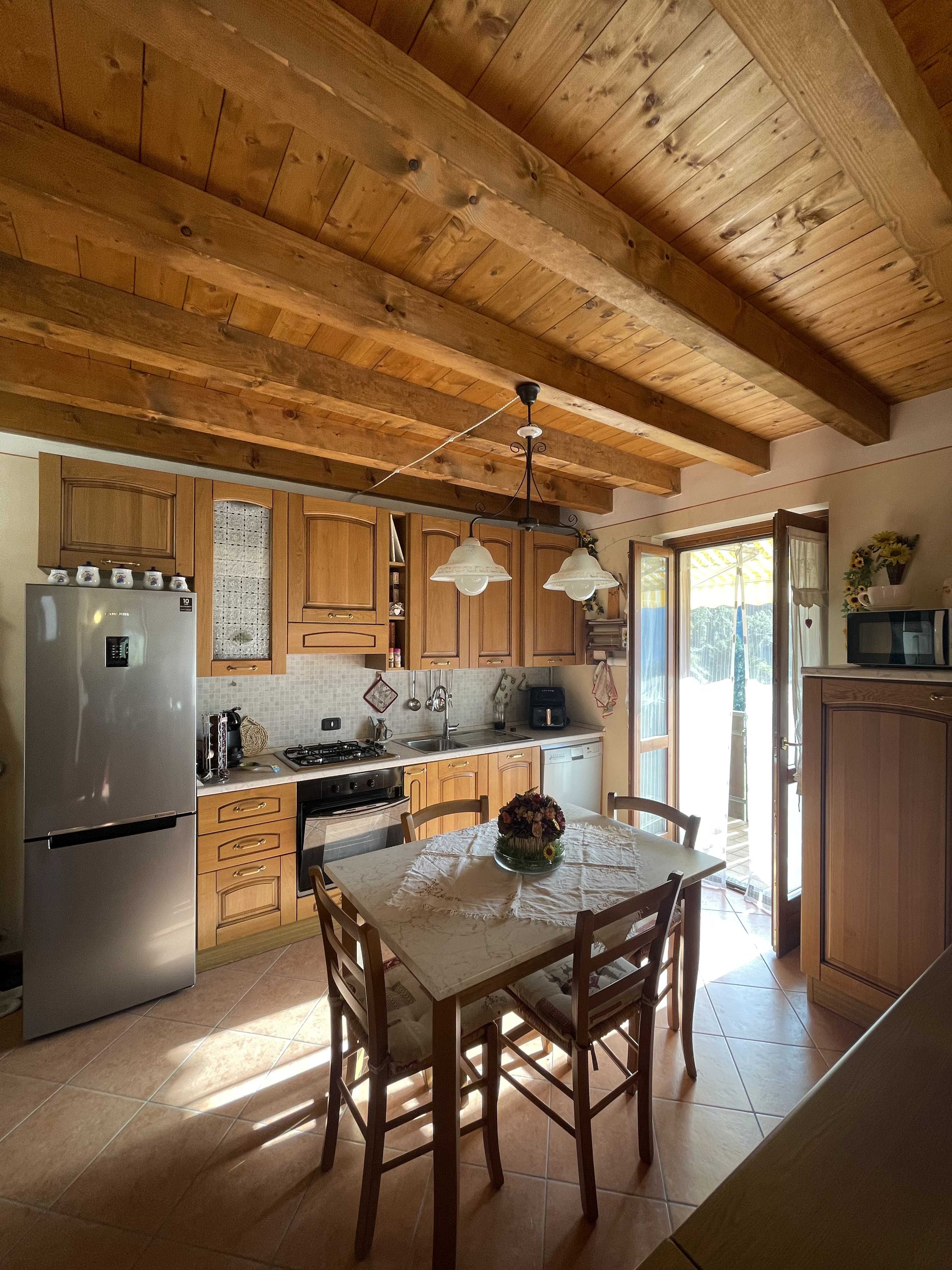 Cucina abitabile arredata con accesso diretto alla terrazza vivibile vista montagne