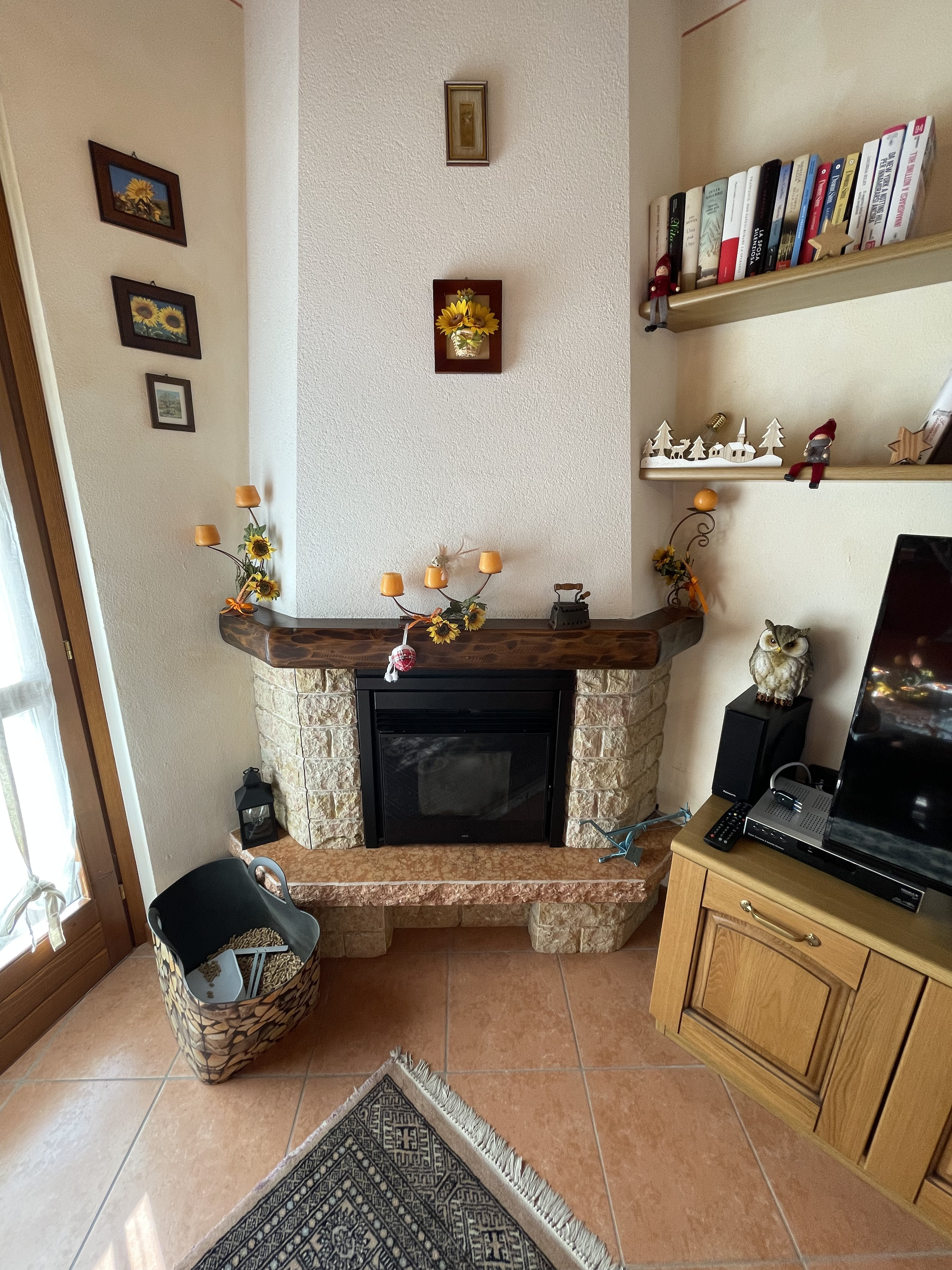Soggiorno accogliente con camino a pellet, ideale per le serate invernali