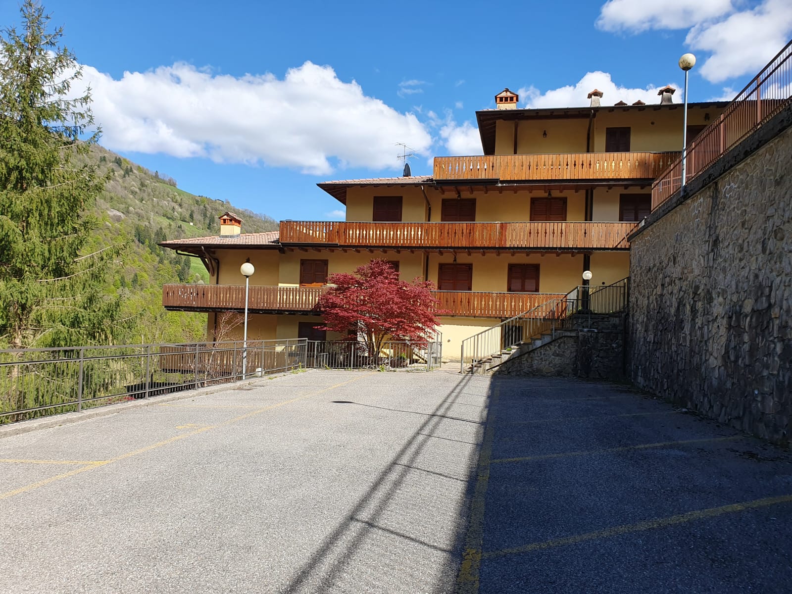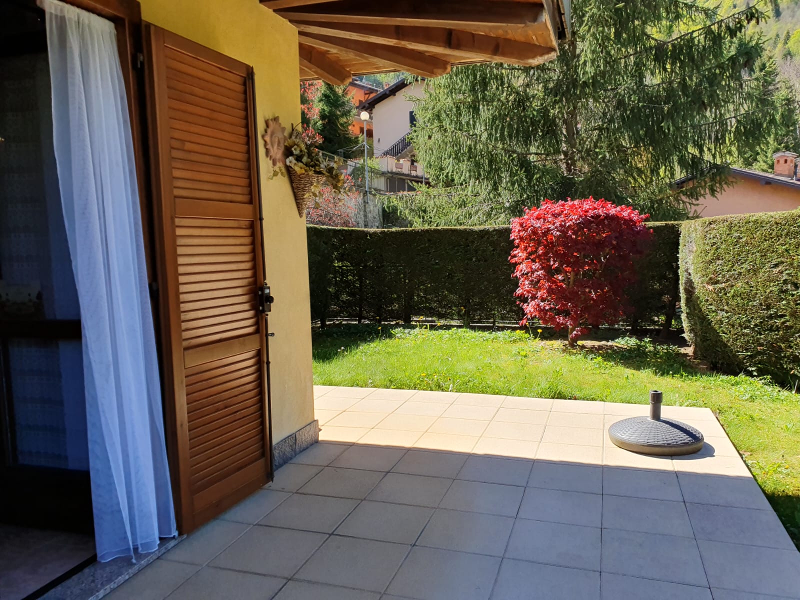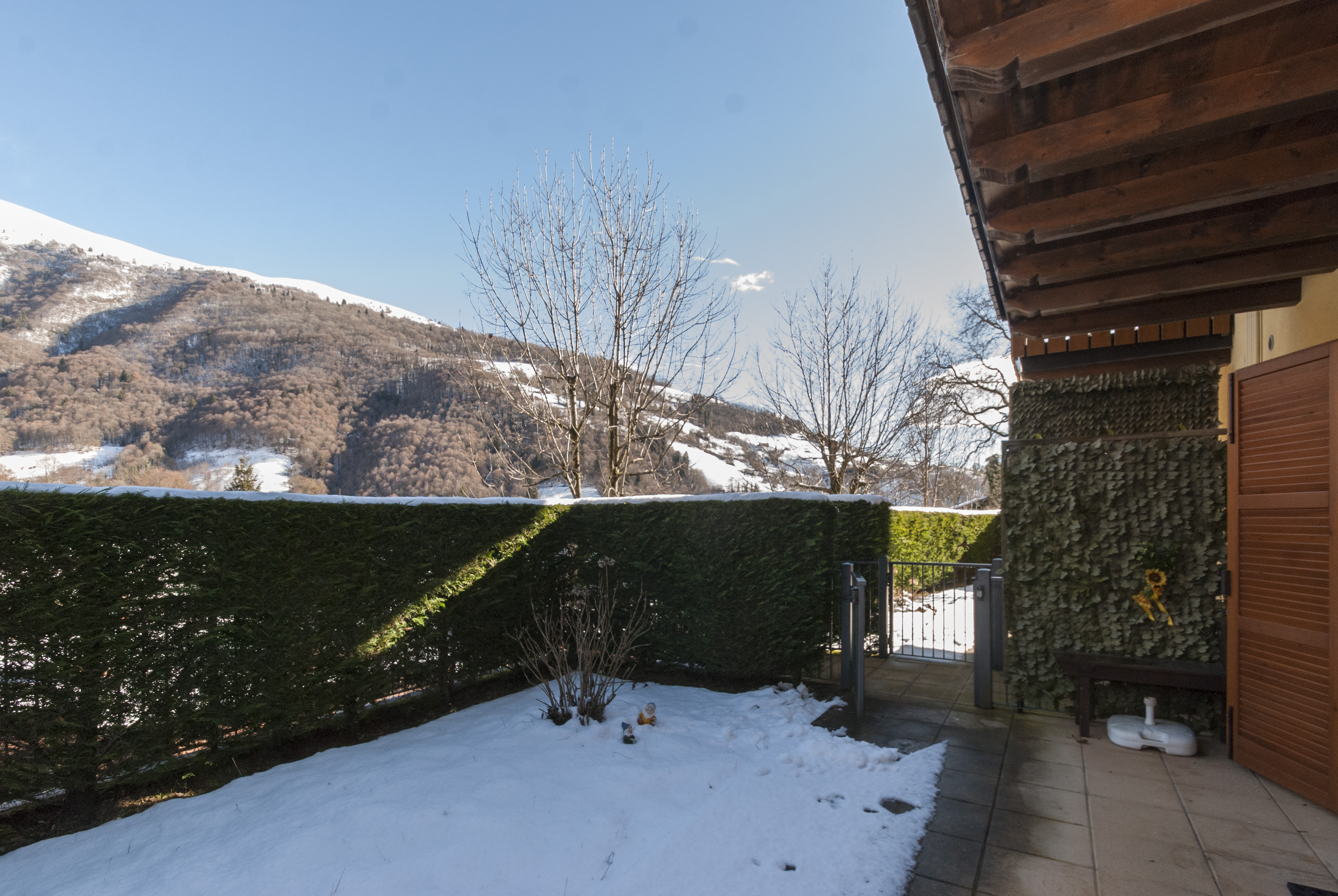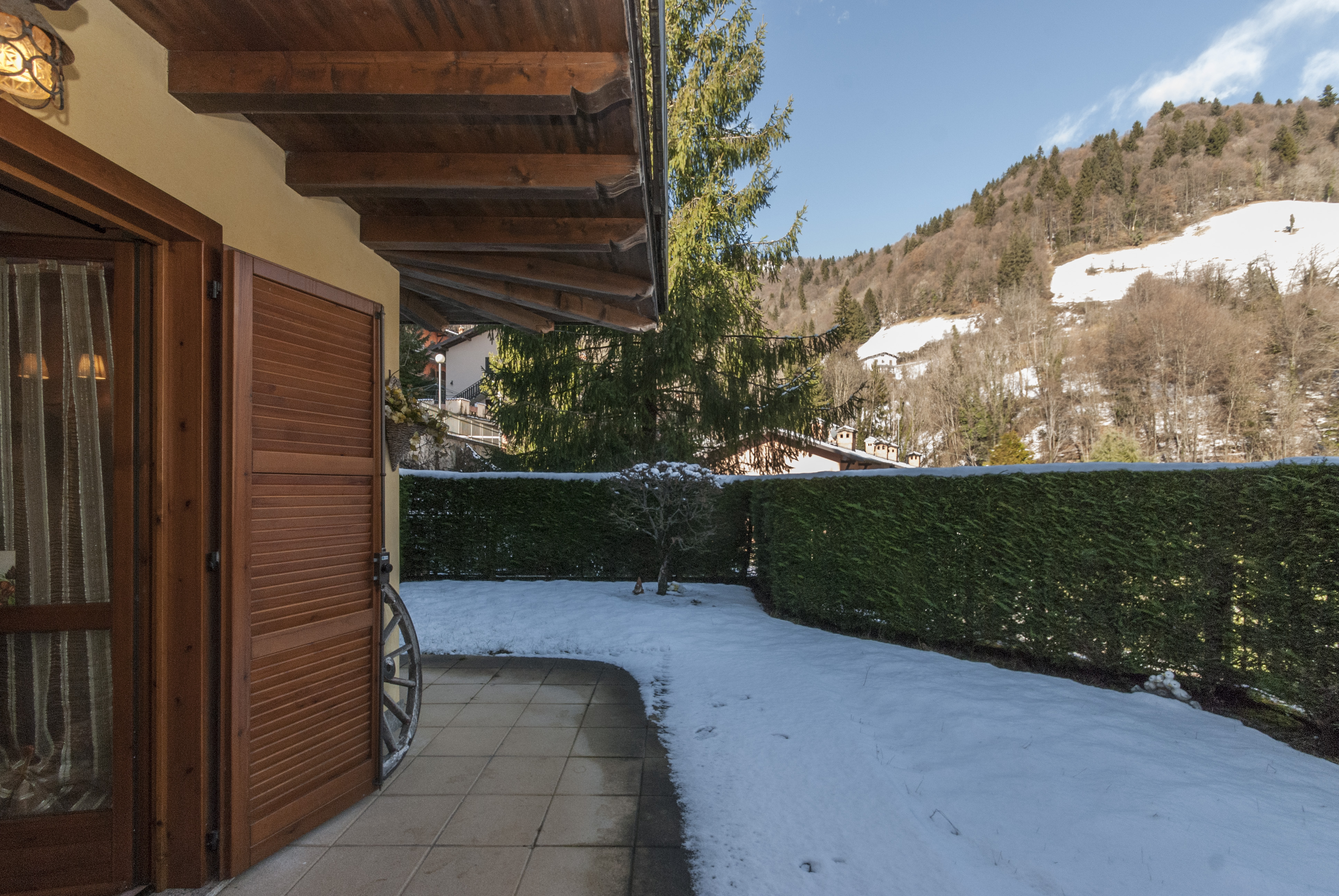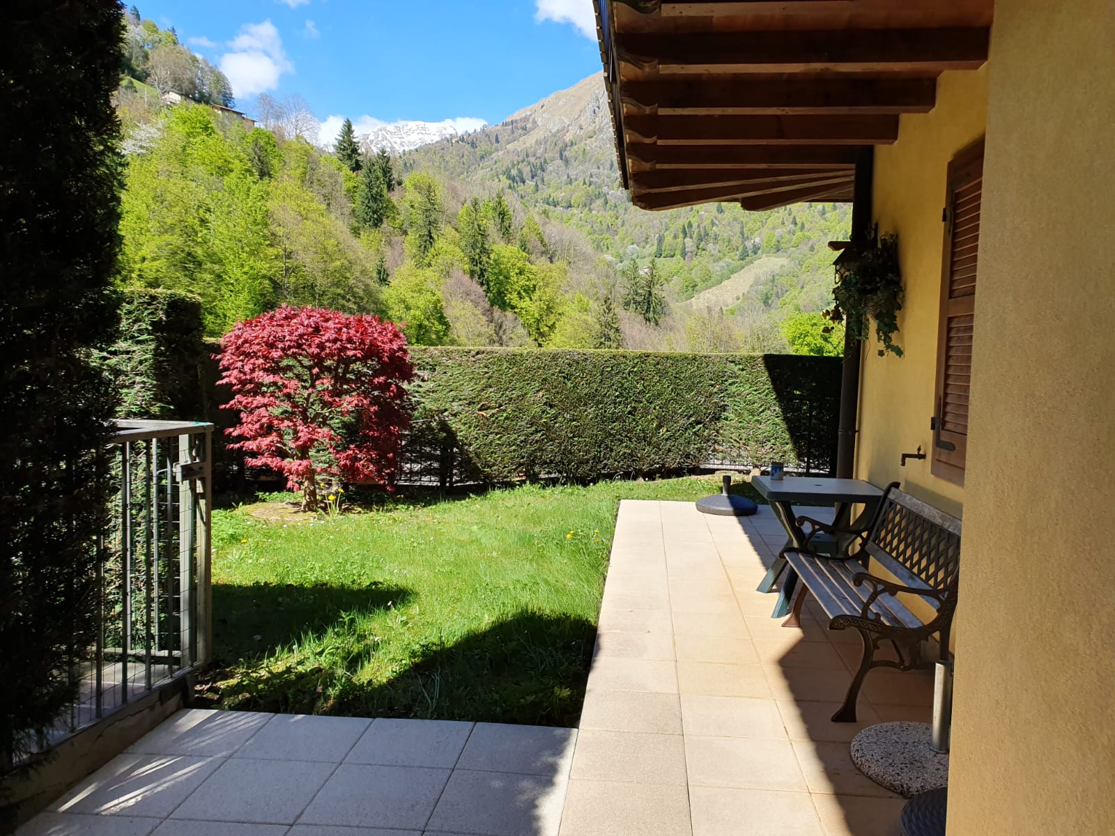 L’appartamento dispone di ingresso indipendente che conduce al giardino e al porticato privato, spazi esterni che circondano l’abitazione e regalano una vista panoramica mozzafiato sulle montagne circostanti, perfetti per momenti di relax all’aria aperta.