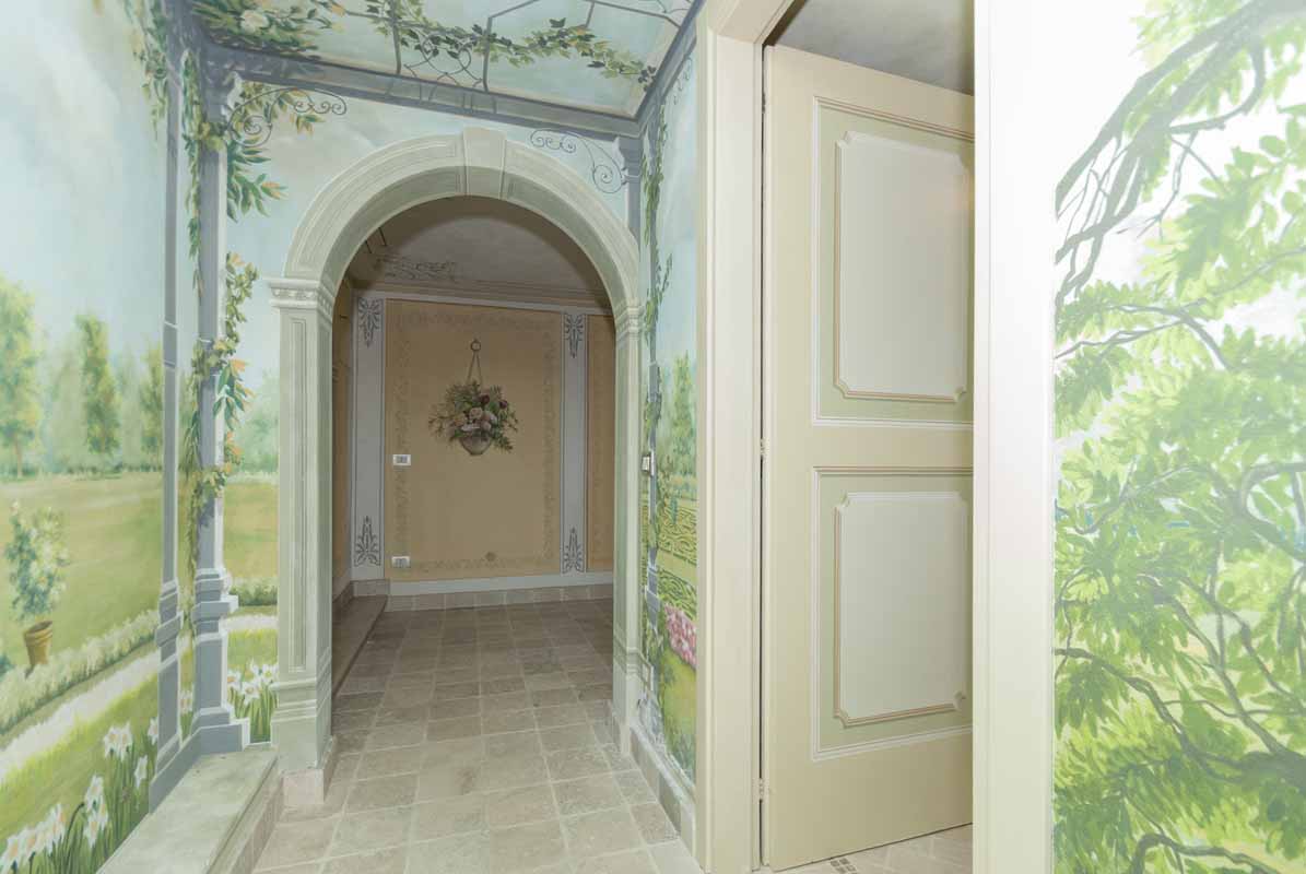 L’abitazione accoglie con un ingresso signorile e un giardino che circonda l’intera villa, creando un contesto raffinato e riservato.