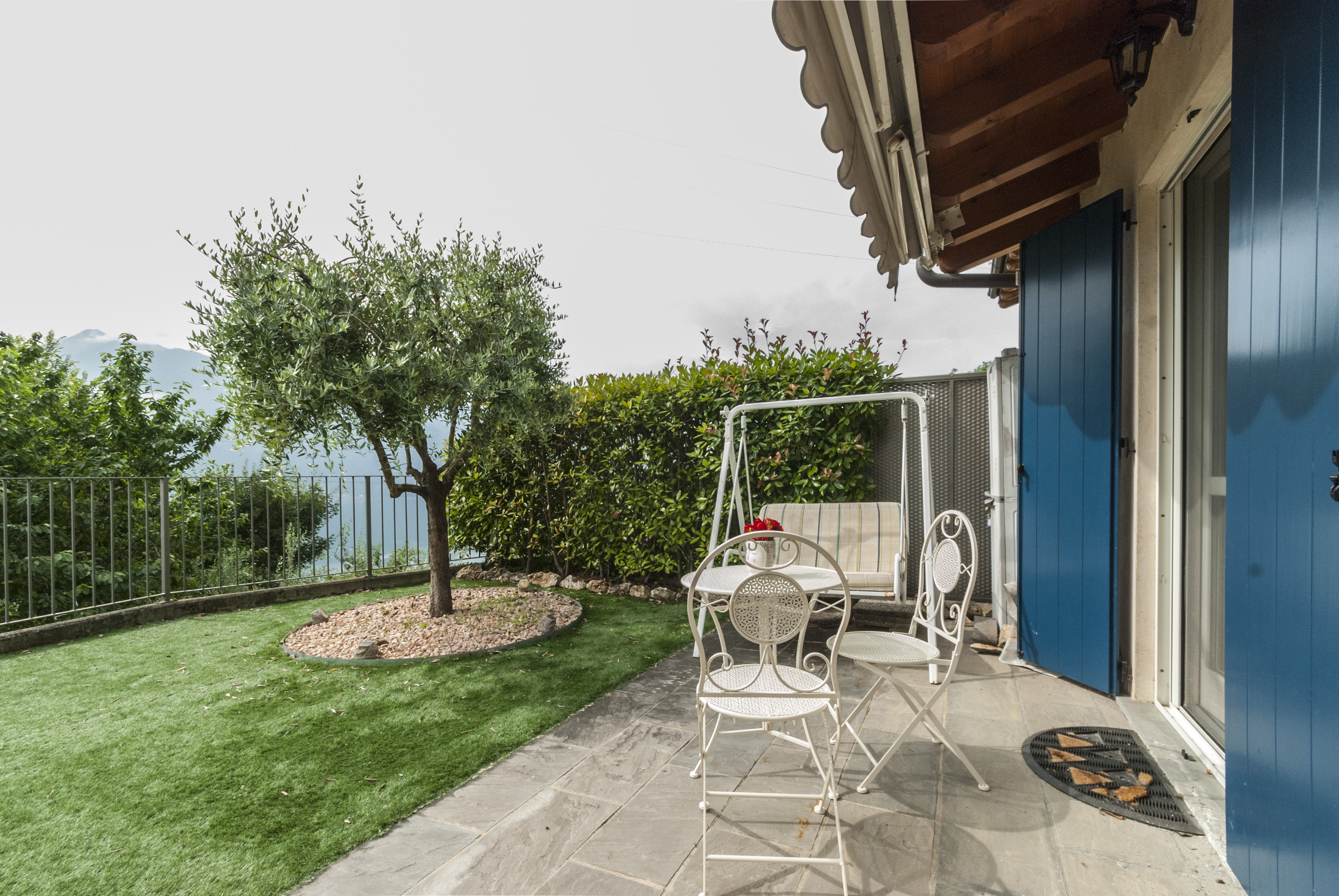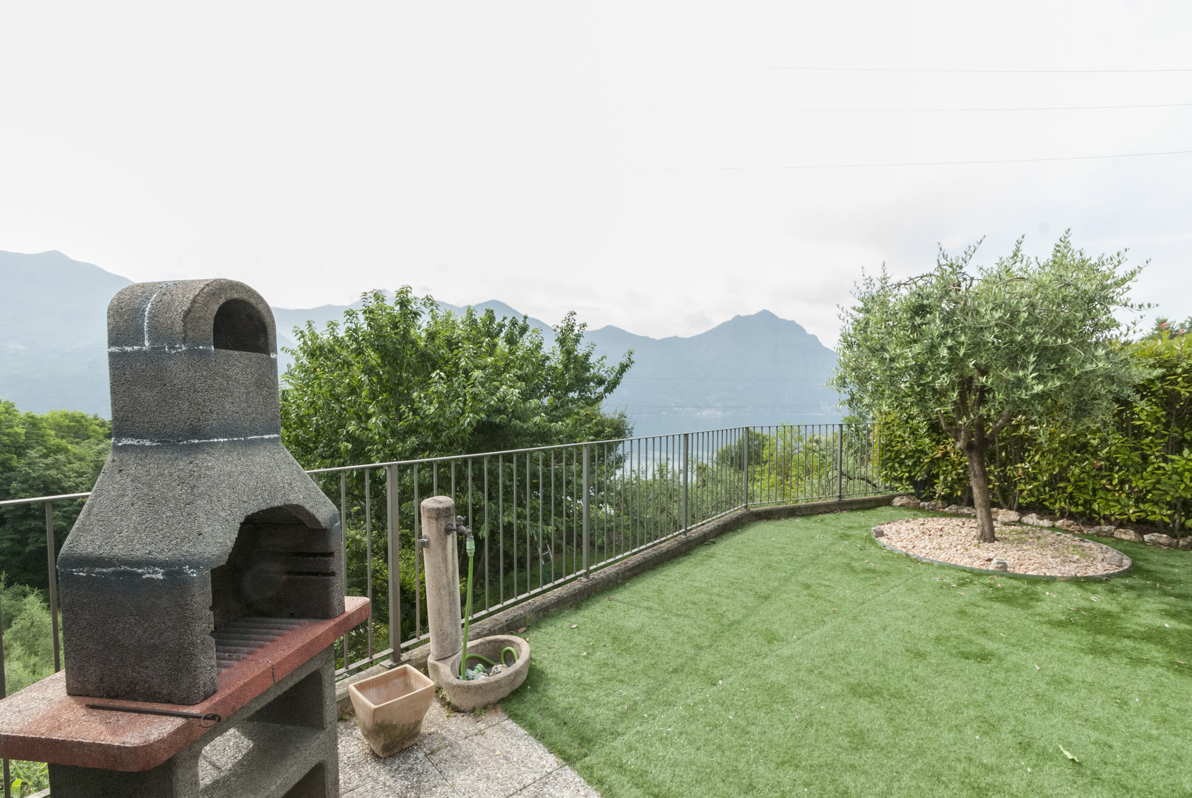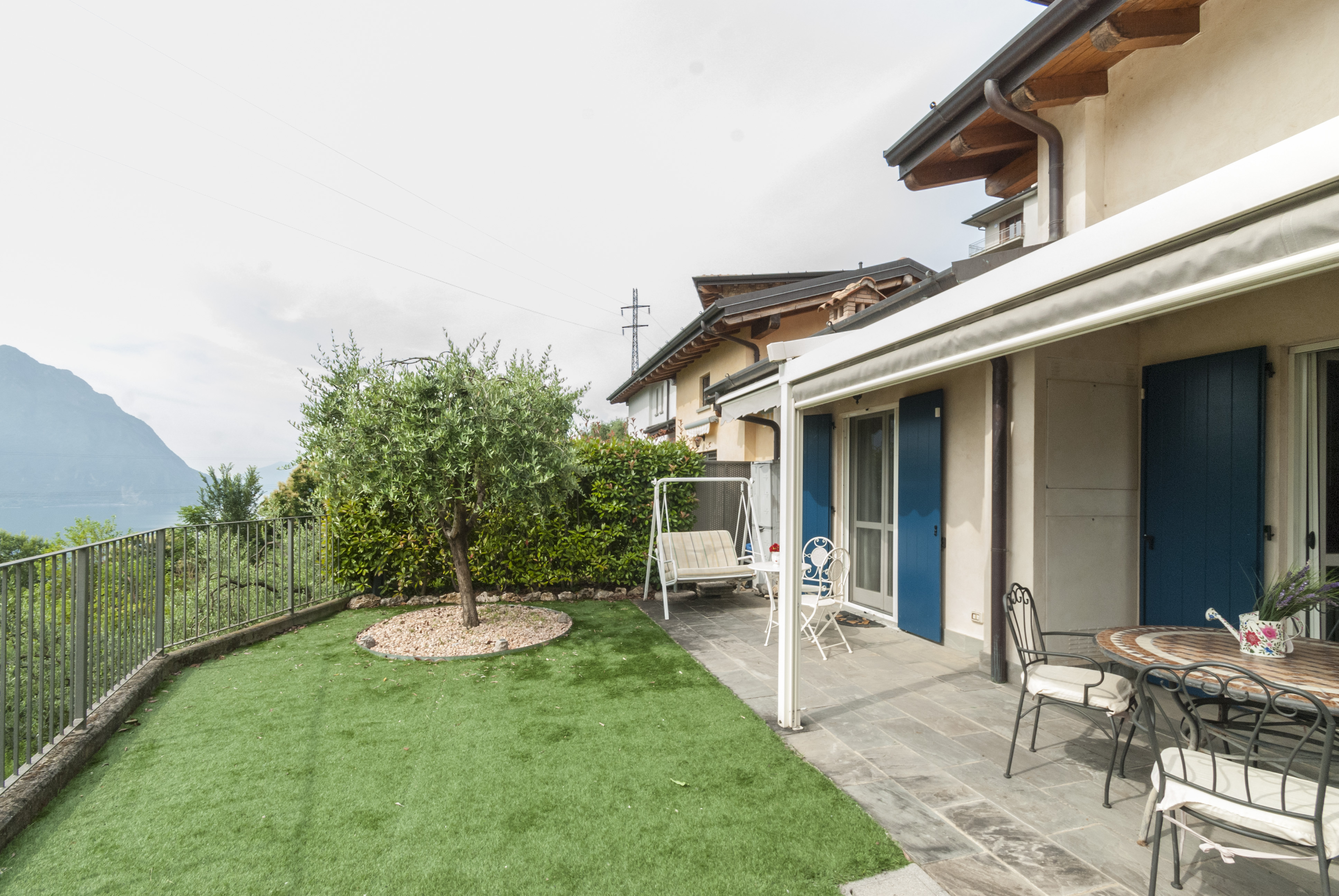 Giardino panoramico attrezzato con pergola automatica, tenda parasole e area pranzo esterna con vista lago